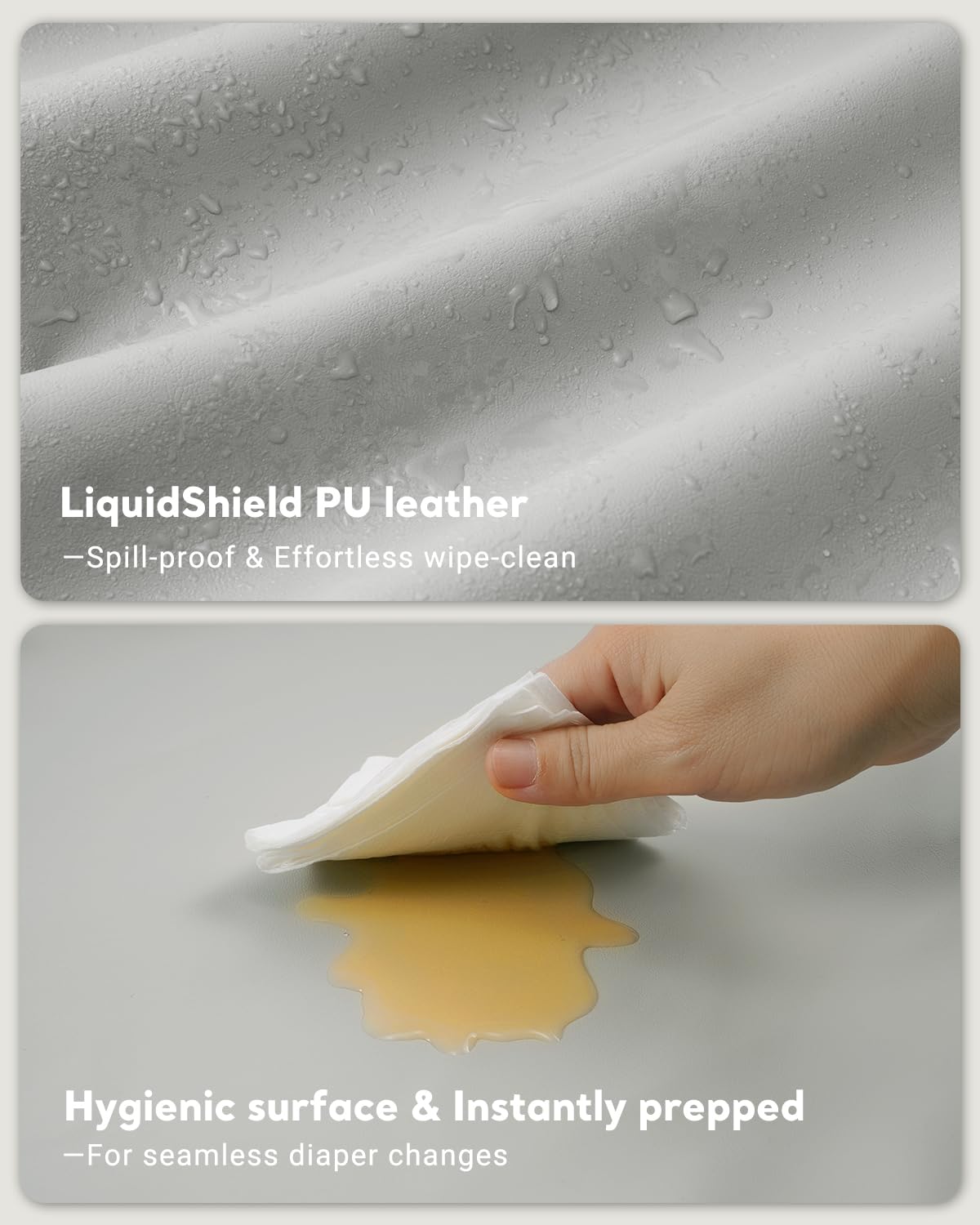 Comfortable and waterproof changing pad with memory foam cushioning and safety strap for added security.